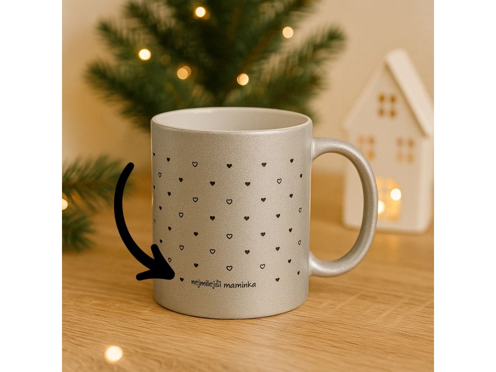 Tento keramický stříbrný hrnek je ozdoben jemným vzorem srdíček, který působí něžně a hřejivě. Je ideální volbou pro ty, kteří chtějí darovat něco osobního, milého a zároveň stylového. Díky příjemnému tvaru se skvěle drží a lesklý povrch mu dodává elegantní vzhled.